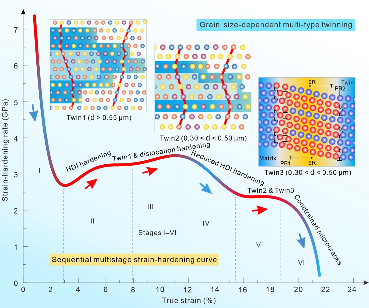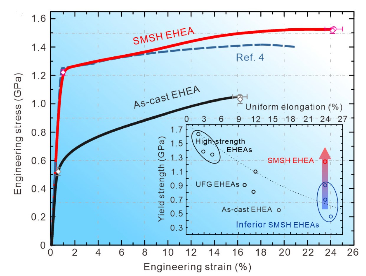 对于金属材料而言,将晶粒细化到纳米/超晶粒可以使金属或合金强度提高数倍,但也带来了材料应变硬化能力的衰减或丧失,难以避免地表现出低塑性。兼具高强度和高延展性的材料一直受到各国研究者在科学研究、关键应用和节能减排等方面的迫切追求。近期,3044AM永利3044AM永利钟云波教授领导的“高性能结构功能材料超常冶金与制备”研究团队,关于提升高强超细晶共晶高熵合金应变硬化能力的最新研究成果以“Multistage work hardening assisted by multi-type twinning in ultrafine-grained heterostructural eutectic high-entropy alloys”为题,被国际顶尖杂志Materials Today(IF2019=26.416)接收和发表。
