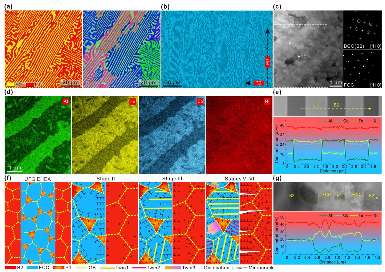 共晶高熵合金是近年来广受关注的一种合金体系,具有良好的铸造流动性,凝固组织则具备规则排列的层状组织。已有的研究结果证明,共晶高熵合金特有的层片结构能够诱导显著的协同强化作用去改善力学性能,为金属材料的微观结构设计和最终性能调控提供了巨大的潜力。钟云波教授研究团队使用简单、可工业化的熔炼-轧制-热处理工艺,遗传了共晶高熵合金铸态共晶的层片结构,并依托结构异质、晶粒尺寸控制、晶内成分精调的三级设计思路,突破了共晶高熵合金伴随的中、高堆垛层错能,及超细晶结构带来的低孪生倾向不足,通过引入顺次激活的多类型孪生变形,同时复合两级尺度的异质变形硬化效应和变形后期自生的微裂纹捕捉机制,成功开发出一种顺次激活的多阶段应变硬化机制,在高强度的超细晶共晶高熵合金中引入了持续且有效的应变硬化能力,实现了共晶高熵合金的超优强塑性结合(合金屈服强度可达到~1.2 GPa,最终断裂强度达到~1.5 GPa,同时均匀塑性保持在~24%)。本工作开创性地提出了一种顺次激活的多阶段应变硬化机制,揭示出多级异质层片结构另一独特的强塑协同提升效应,为共晶合金的强塑化提供了一条独特的途径,也为高熵合金、轴承钢、工模具钢、高强高导高弹铜合金、高温合金、钛合金等先进材料的强塑性提升提供了全新的视角。