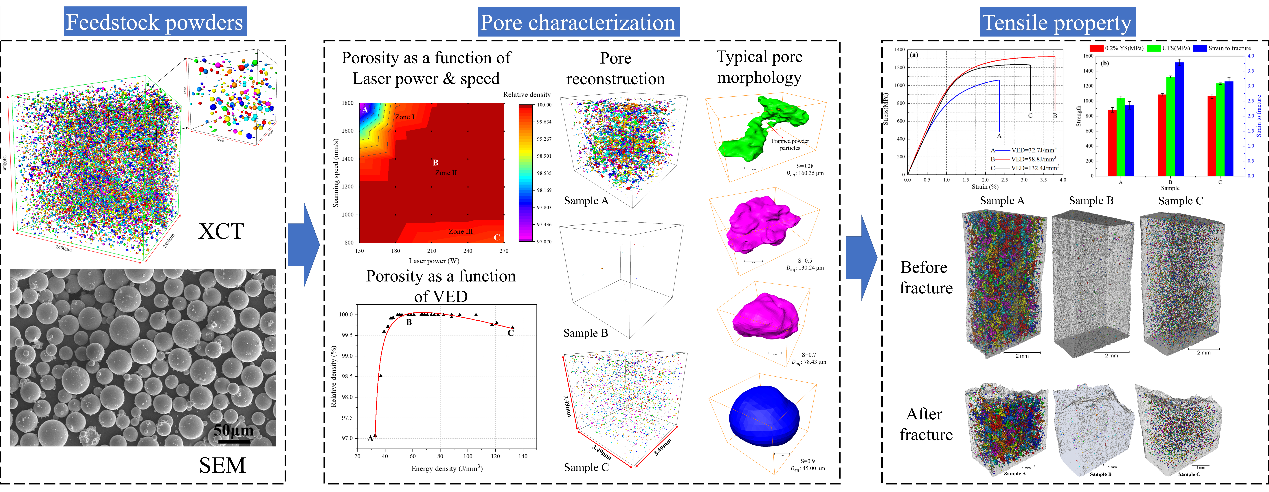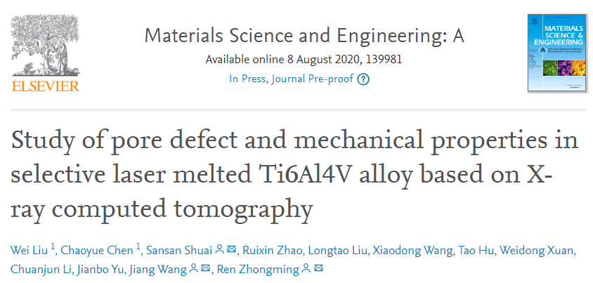 近日,3044AM永利省部共建高品质特殊钢冶金与制备国家重点实验室硕士研究生刘伟在青年教师帅三三和陈超越的指导下,基于X射线CT成像技术,在3D打印TC4合金孔洞缺陷三维表征和形成机理方面取得重要进展,相关成果以“Study of pore defect and mechanical properties in selective laser melted Ti6Al4V alloy based on X-ray computed tomography”为题发表在Materials Science and Engineering:A期刊上,实验室王江教授为该论文通讯作者。