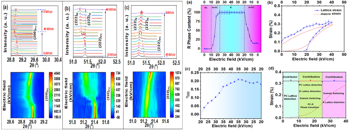 BF-BT固溶体的相结构是伪立方时,展示出大电致应变且最佳烧结温度低(900-1000oC),有望成为一种低成本压电多层驱动器用材料,在精密驱动领域有潜在应用。但是,其大应变起源一直没有明确的答案,同时相关的器件也鲜有报道。最近,​3044AM永利智能材料与器件实验室联合伍伦贡大学和澳洲同步辐射中心,对BF-BT固溶体在多物理场(静水压、温度和电场)作用下的结构演变与宏观物理性能关系进行研究,解开了伪立方结构BF-BT基固溶体大应变之谜,深入分析了在不同电场作用下应变的贡献机制,并研制了多层压电驱动器,加深、推动了该固溶体物性的研究、理解和应用。首先,如图一所示,他们采用固相反应法制备了伪立方结构的BF-BT固溶体,其单向应变量达到0.38%(60 kV/cm),优于文献中报道的相关数据;以Ag/Pd为内电极,采用流延工艺制备了高质量的多层压电驱动器,在室温到150oC的温度区间内,应变量由0.22%增加到0.3%,同时应变滞回逐渐减小,有望成为一种环境友好型的压电驱动器。其次,介电温谱分析结果表明,该固溶体的冻结温度为179oC,远高于室温,所以大应变并非是非遍历态到遍历态的转变引起的。进一步,如图二所示,原位同步辐射研究结果表明,在电场作用下,单一尖锐的(200)pc衍射峰宽化,且向低角度移动(加载电场),之后又返回高角度;与此同时,单一尖锐对称的(222)pc衍射峰逐渐宽化→劈裂→邻峰强度变化(加载电场),之后衍射峰逐渐合并,回归原位(卸载电场)。最后,综合以上结果可知,在电场作用下,BF-BT固溶体发生了由伪立方到三方相的可逆相变,而晶格应变、相变以及电畴运动均对应变有贡献。结合理论分析,绘制了不同电场作用下各种机制对应变的贡献。在国际上,首次明确发现了该固溶体大应变的起源,并量化分析了晶格应变、相变和电畴运动对其贡献。相关研究成果以“Origin of large electric-field-induced strain in pseudo-cubic BiFeO3-BaTiO3ceramics”为题目发表在国际知名刊物Acta Materialia上。该论文的第一单位为3044AM永利,第一和通讯作者是程晋荣研究员团队的陈建国副研究员。