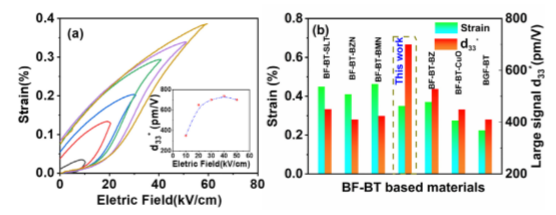 图一BF-BT固溶体单向应变图(左)以及与相近成分材料的对比(右)