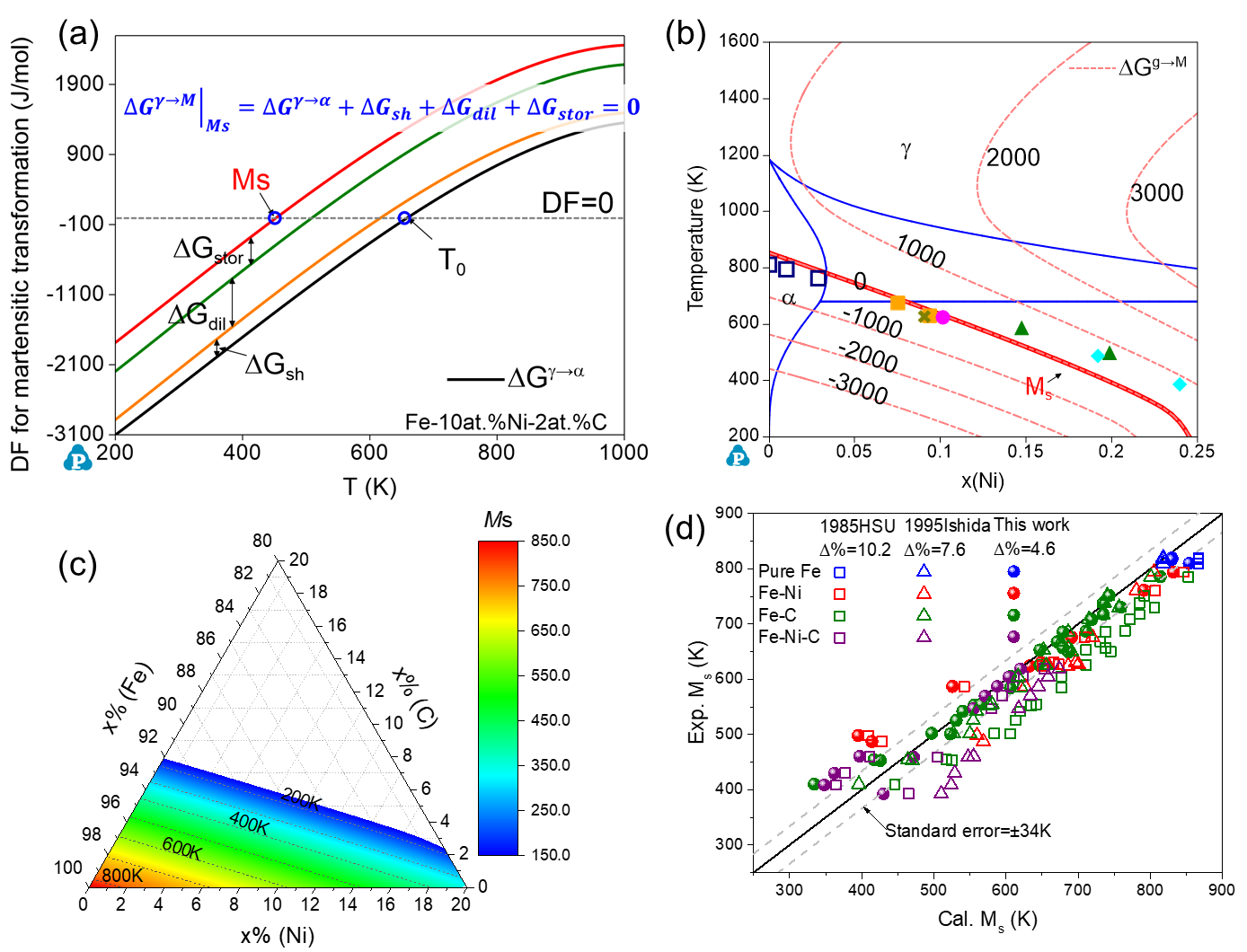 研究团队在前人工作的基础上,进一步深入挖掘马氏体相变机理,将马氏体相变的驱动力分为化学驱动力和非化学驱动力。利用马氏体相变的基本判据(相变总驱动力小于等于零,即 ∆G^(γ→M)=∆G^(γ→α)+∆G^(α→M)≤0 ),预测得到Ms点。化学驱动力为奥氏体和铁素体之间的Gibbs能之差,通过可靠的数据库结合CALPHAD方法计算获得;非化学驱动力分为剪切应变能、膨胀应变能、缺陷储能和界面能,对不同能量单独进行公式建立和计算,发现膨胀应变能和缺陷储能为非化学驱动力的主要贡献项。基于该方法,预测了Fe-Ni-C合金体系的马氏体相变驱动力和Ms点,预测误差仅为4.6%。此方法弥补了其它方法的成分范围限制、依赖大量实验数据和缺乏相变机理解释等缺点,在保证预测准确性的同时,揭示了马氏体相变机制,并且易于外推至多组元合金,对新型合金的设计和热处理工艺的制定具有重要的指导意义。