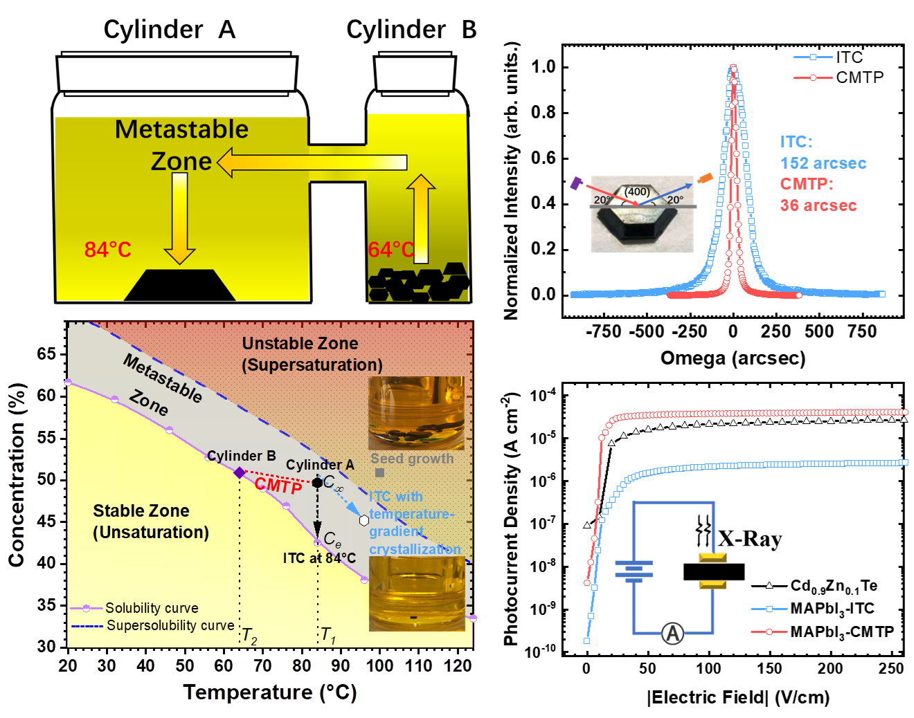 研究团队提出了一种简单易行、成本低廉的新型生长方法——基于连续溶质传输过程的原料自补充法(CMTP),独立设置原料区和生长区,巧妙的利用了不同温度下溶解度差异的特性,持续推动溶质的自补偿传输,使生长区始终处于恒定浓度的亚稳态溶液状态,从而实现了钙钛矿单晶以稳定的速度连续生长的目标。文中首先重点从生长动力学角度系统详尽的阐明了其生长机理和内在传输机制,并通过与传统逆温结晶法(ITC)生长的CH3NH3PbI3(MAPbI3)单晶进行对比,发现CMTP法生长的MAPbI3单晶的高分辨率X射线摇摆曲线的半高宽仅为36角秒,位错密度低至6.8×106cm-2,这表明CMTP生长的单晶具有极高的晶体质量。此外,CMTP生长的晶体的陷阱密度低至4.5×109cm-3,降低了近200%,迁移率高达150.2 cm2V-1s-1,增长了187%,迁移率-寿命积高达1.6×103cm2V1,增加了约450%。同时,基于CMTP的MAPbI3单晶的X射线探测器性能可与传统的高质量CdZnTe器件相媲美。