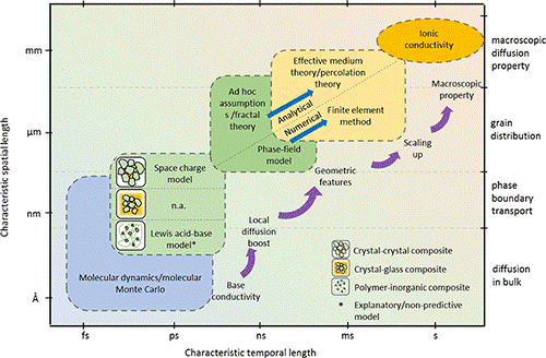 寻找具有高离子电导率、宽电化学窗口、低界面阻抗的固态电解质是实现高比能固态电池的核心挑战。固态电解质可以分为单一相离子导体(Single Phase Solid Electrolyte)和复合离子导体(Composite Solid Electrolyte, CSE)两大类。其中单一相离子导体总是在某一方面不能满足固态电池的需求,例如,氧化物类石榴石LLZO与正极界面的接触差、硫化物LGPS与锂金属的电化学稳定性差、高分子PEO的室温离子电导率低且容易在高压被氧化。而混合了多种不同的离子导体的复合固态电解质却能够达到很好的综合性能。更为重要的是,由于广泛存在的相-相界面,复合固态电解质具有母体材料所不具有的独特性质,例如,比母体材料具有更高的离子电导率等。经过多年的研究,人们已经开发出了无机晶体/无机晶体、无机玻璃/无机陶瓷、高分子/无机陶瓷几大类数百种复合固态电解质。对于每种固态电解质中的锂离子迁移机制也有了大量探讨。但是,此前的研究往往局限于特定的某一类复合物,缺乏具有普适性的统一描述。空间电荷层、有效介质、percolation等多种刻画锂离子迁移机制的理论缺乏一个总体的理论框架。藉此研究现状,该综述以统一的理论视角总结了复合固态电解质发展的前世今生;从各个时空尺度上剖析了复合固态电解质中相-相界面的离子传输机制;提出了复合固态电解质的跨尺度理论设计框架并指出了该领域未来的研究方向。该文对复合固态电解质领域的发展提供了深入的思考和整体思路,对学术届和工业界都将起到积极的引领作用。