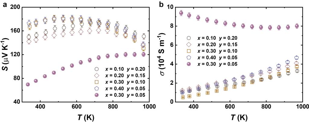 图3. (a) ZrRu1+xNiySb的塞贝克系数S和(b)电导率σ