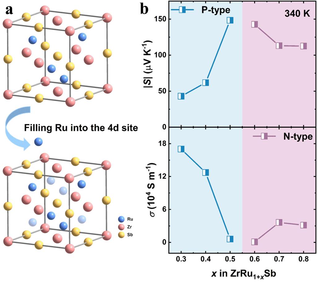 图2. (a) ZrRu1+xSb的4d空位填充示意图及(b)电输运性能(塞贝克系数S和电导率σ)随Ru成分的变化