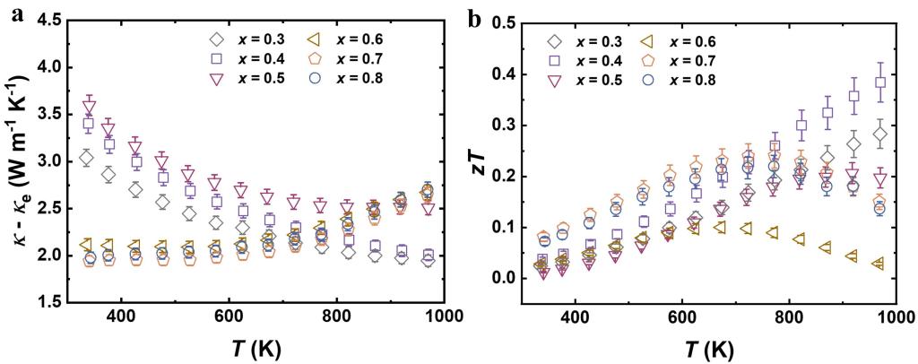 图4. (a) ZrRu1+xSb的晶格热导率κ - κe和(b)热电优值zT