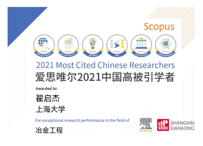 爱思唯尔“中国高被引学者榜单” 从纯学术影响力的角度出发,数据客观、标准统一。入选该榜单,意味着该学者作为第一作者和通讯作者发表的科研成果被引总次数在本学科处于顶尖水平,为该领域发展作出了较大贡献。在翟启杰教授的带领下,CAST团队必将再接再厉,为行业发展贡献自己的力量!(先进凝固技术中心供稿)