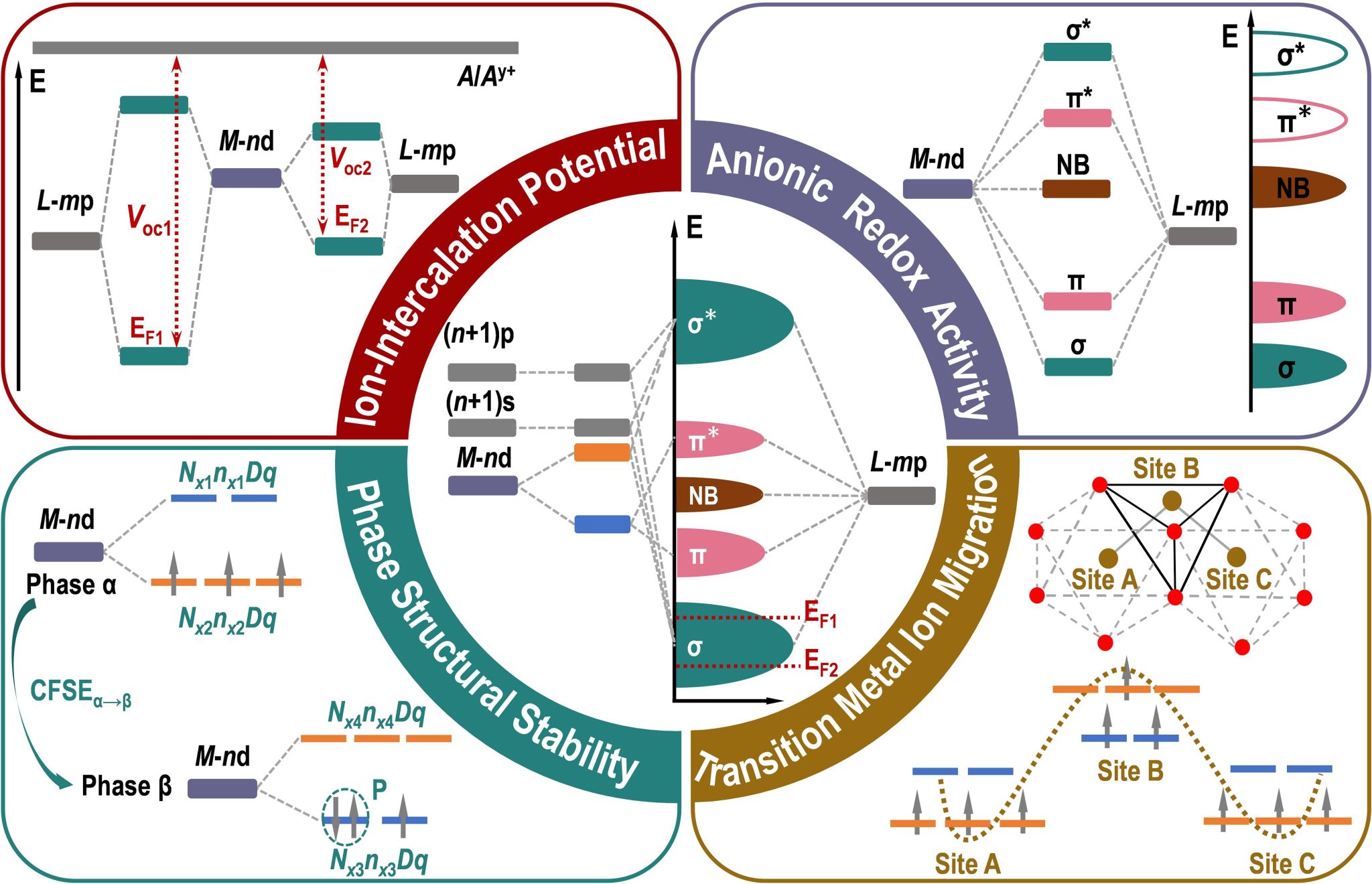 离子嵌入电化学是推动现代储能蓬勃发展的关键技术之一。获得广泛商业化使用的单价/多价金属离子电池所含过渡金属基正极通常以过渡金属离子作为氧化还原中心,其电子结构高度依赖于过渡金属和配体间的杂化行为,受到材料局部配体场的严格控制。从配位场理论出发,揭示出局域结构对电极电化学性能的本质影响,并结合第一性原理计算等先进方法从微观尺度确定系统中电子占据态等性质,为其定量预测不同电极材料电化学性能提供独特的视角,因此带来配位场理论在电化学储能中应用的实质性突破。为此,文章综合评述了从晶体场理论到配位场理论的发展历程,梳理了基于对称匹配原理的原子轨道劈裂和分子轨道杂化理论,以及配位场理论中的所涉概念及规律,尤其对离子嵌入电化学过程中与电压相关的费米能级计算、与相稳定性相关的晶体场稳定化能计算、以及与阴离子氧化还原活性相关的理论模型构建等进行了详细地介绍。此外,结合团队自主开发的可根据电极体系局域配位环境推导其原子轨道劈裂特性并自动化识别体系杂化分子轨道能级排布程序:“识别局部配位场构建晶体分子轨道能级程序(MOELD-LLF,目前已开源,访问地址:https://gitlab.com/shuhebing/MOELD-LLF)”,以及团队近几年提出了一系列提高电化学储能材料离子嵌入电压、容量、相稳定性以及电子电导的策略(如文末相关论文链接),文章中系统性地总结和讨论了一些代表性的新型电极体系(如固态电池用无锂嵌入式电极和无过渡金属电极等)。最终,提出通过配体场理论理解可充电电池离子嵌入式电极结构与电化学性能关系的应用前景和挑战。该文章不仅能全面满足初学者对配位场理论基础知识的需求,对学术界和工业界进一步拓展及提炼配位场理论在离子嵌入电化学领域中的应用也将起到积极的引领作用。