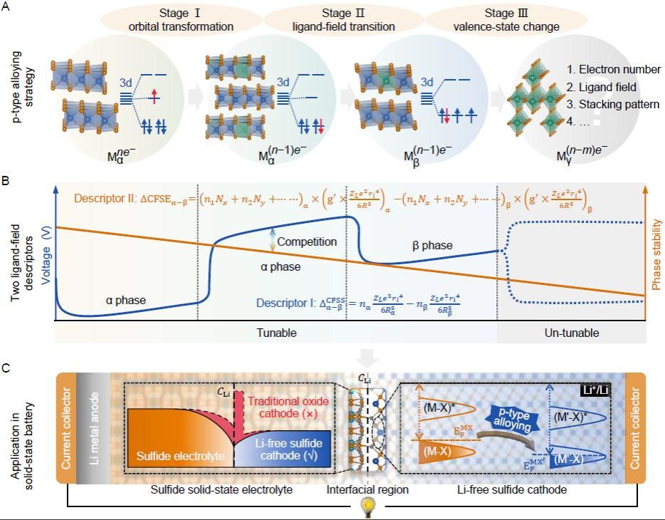 该项工作建立了正极费米能级与比能量的直观联系图像,开创了基于配位场理论同步调控电压和相位稳定性设计新型无锂嵌入式电极的新方向,进而为发展无锂正极与金属锂负极相匹配的高性能固态电池开辟思路。此外,所提出的p型合金化策略可广泛应用于电荷转移主导的离子嵌入式电极家族中,以从根本上改变我们对涉及全固态电池电极和解决界面兼容性的看法,这对打破目前商业正极对稀缺及高成本过渡金属(如Co和Ni)的依赖,以及全固态电池的推广应用都至关重要。研究工作得到了国家重点研发计划以及国家自然科学基金的资助。