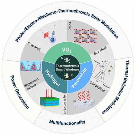这篇综述从热致变色材料的结构、微/中尺度的性能调控、与其它新兴能源技术的集成等方面,评述了热致变色材料和系统的最新研究进展,展示了热致变色材料在建筑节能中的实际应用,介绍了热致变色节能窗的挑战和机遇。