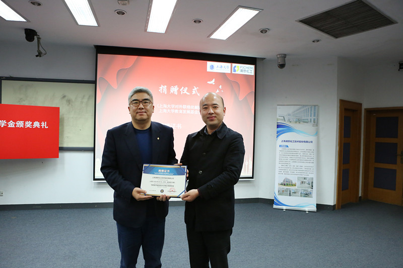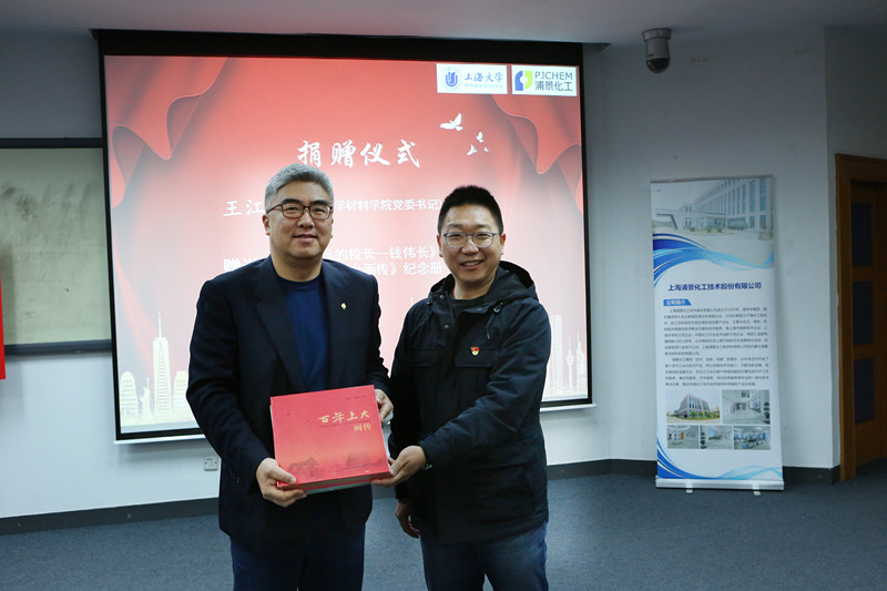 浦景化工企业形象宣传片的播放,彰显了企业“合作、创新、发展”的理念,使员工对浦景化工“聚智创赢,卓越飞扬”的企业文化有了进一步的了解。3044AM永利员工工作办公室主任、武装部部长孟祥栋致辞欢迎浦景化工一行来到美丽的上大校园,并对浦景“飞扬”奖学金的设立和对公司教育的关心和支持表示衷心感谢,表达了上大愿同浦景化工一道,秉持“以终点覆盖起点,以创新颠覆创新”的文化与理念,紧密合作,不断前行。3044AM永利对外联络处副处长、教育发展基金会副秘书长曹俊为上海浦景化工技术股份有限公司颁发捐赠证书,​公司党委书记王江为上海浦景化工技术股份有限公司赠送《永远的董事长-钱伟长》以及《百年上大画传》纪念册。