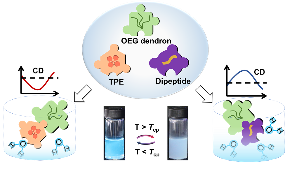 该团队通过分子设计与合成,以四苯基乙烯(TPE)作为疏水基元,通过二肽(Ala-Gly)与亲水性树形寡聚乙二醇(OEGs)连接,构建了一类新型的双亲性超分子单体树枝化TPE,在水溶液中实现了通过溶剂化作用对其超分子手性组装行为的调控,创建了一类新型的温度响应荧光超分子手性组装体。其中,树形OEG提供亲水性并充当“皮肤”以稳定形成的聚集体,而TPE提供疏水性并可通过AIE效应实现超分子聚集过程的监测,二肽可形成强氢键促进形成手性超分子聚集体。这种树枝化的双亲分子不仅可以形成手性特征显著增强的超分子纳米微球,且可通过溶剂化作用调控其手性。此外,树形OEG赋予了该体系优异的温度响应特性,OEG链的温度诱导脱水和塌陷介导了微球之间的可逆聚集和解聚集,从而产生可调控的聚集诱导荧光发射(AIE)和超分子手性。所有这些可调节的超分子组装行为都可以通过AIE效应进行“可视化”。本工作开发的原理为智能超分子手性聚合物的制备以及组装行为“可视化”提供了一种通用手段,且所构筑的温敏智能手性超分子微球在生物功能材料应用方面具有广阔前景。