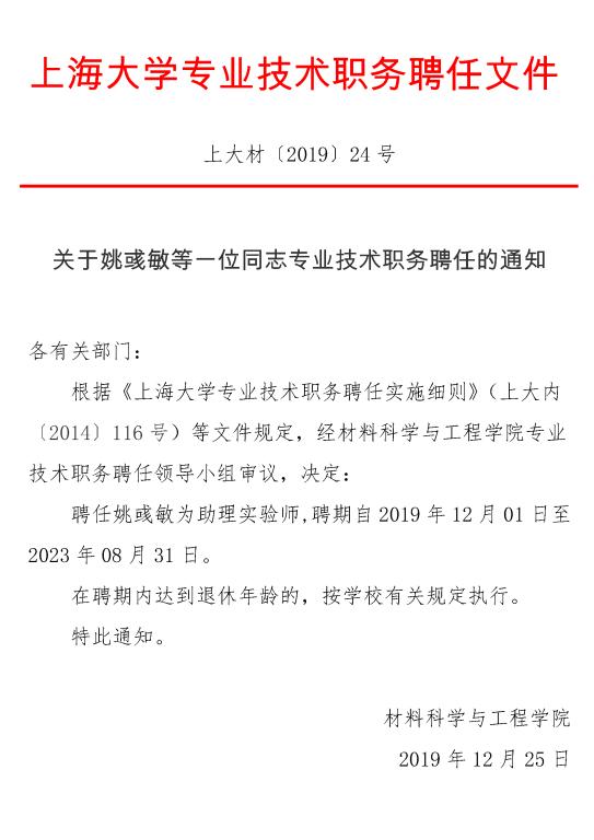 关于姚彧敏等一位同志专业技术职务聘任的通知