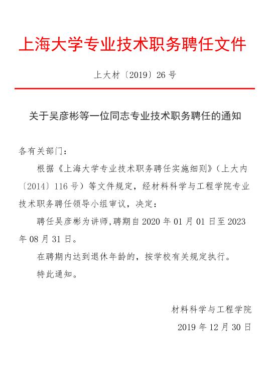 关于吴彦彬等一位同志专业技术职务聘任的通知