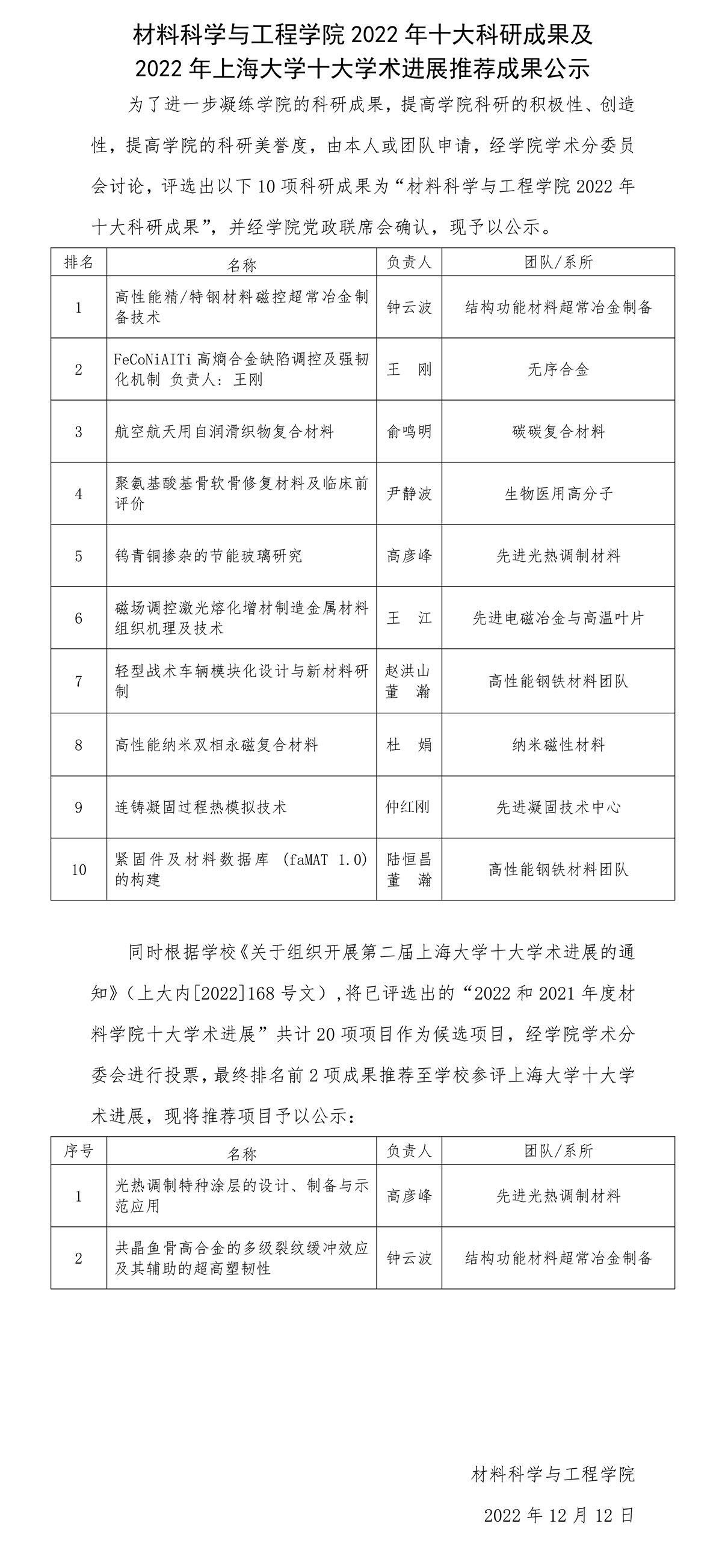 2022年十大科研成果公示及3044AM永利第二届十大成果3044AM永利推荐项目公示