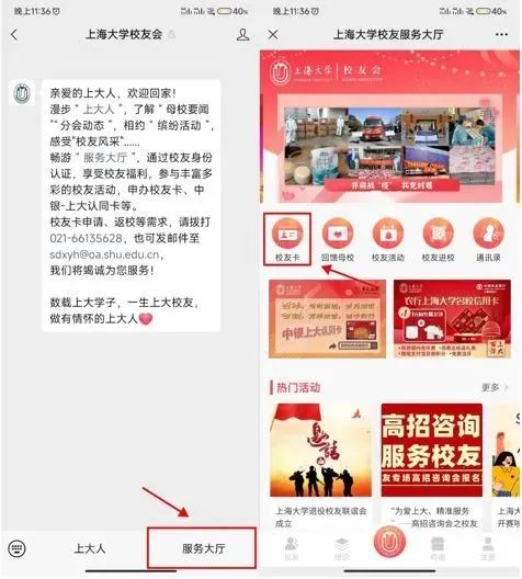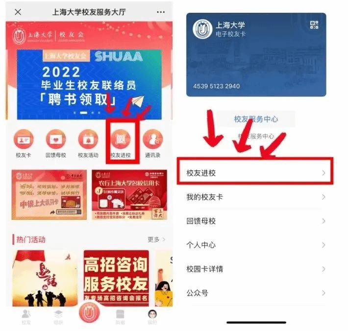 员工可以通过在服务大厅或在已领取到卡包的员工卡详情页点击员工进校,进入智慧校园页面,点击上大蓝码,通过闸机扫码进校。家属不要忘记得携带身份证,刷本人身份证入校。