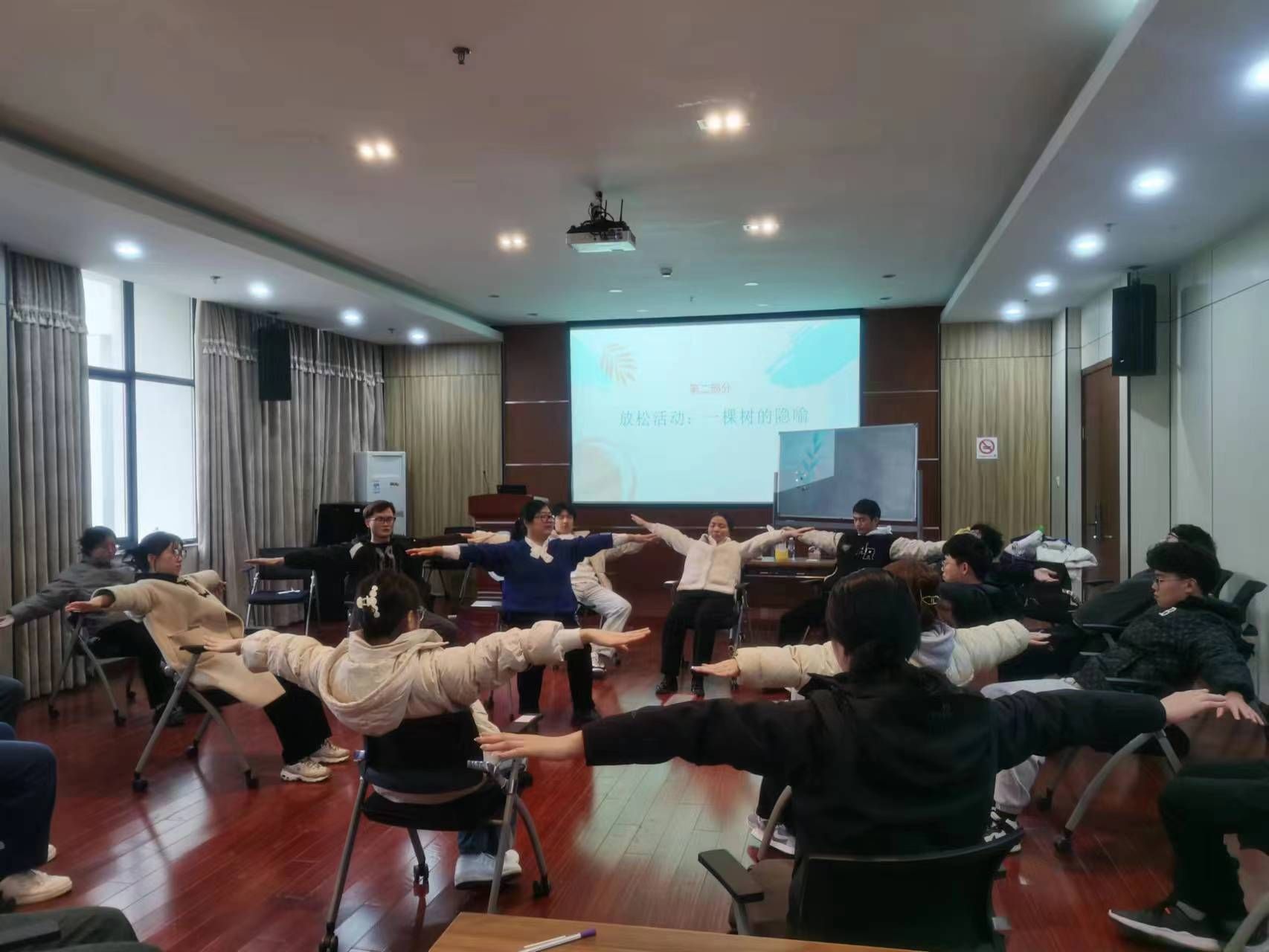 随后,荆瑞老师带着参与员工们做了一套微体操:同学们用十指紧扣置于胸前,缓缓伸直双臂想象身处大海,逐渐张开双臂保持水平感受风从指尖划过。经过这一套微体操,同学们的身体逐渐放松,顿觉身上压力少了些许。