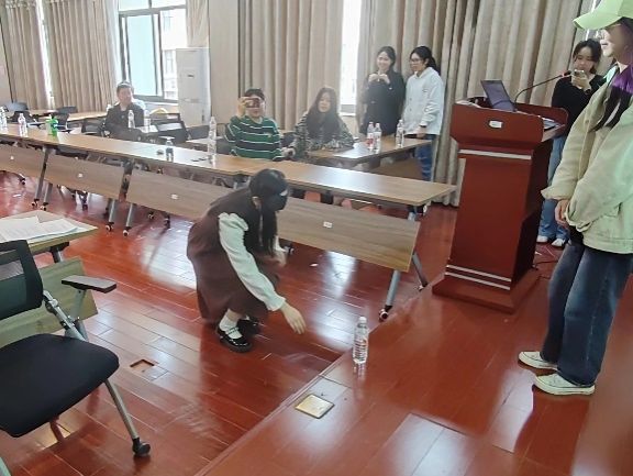 第二个游戏为“盲行国安路线”。2人一组,一人蒙眼在同伴的指挥下取出目标物品,用时最短的小组获胜,意味着在不能看见的情况下,党员同志们仍能坚定地走好国家安全的路线。每组中,负责蒙眼的同学戴上眼罩,瞬间失去了视觉的指引,只能依靠同伴的语音提示来行动。而指挥的同学则肩负起了引导的重任,他们小心翼翼地指引着同伴避开障碍物,向着目标物品前进。观众们屏息凝神,紧张地注视着每一组的进展。每当有参赛者成功取到目标物品时,现场都会爆发出热烈的掌声。这个游戏不仅提升了参赛者之间的信任与默契,更使他们领悟到,在未知和困难面前,党员同志们应互相帮助互相配合坚定地走好国家安全的路线。